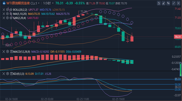 周二(2月25日)欧盘时段,WTI原油期货交易小幅走跌,盘中稍早短暂突破周一高点后走势有限。油价整体市场前景仍谨慎看涨。然而,持续的需求担忧和潜在的地缘政治发展,特别是伊朗,带来了下行风险。
