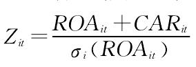 其中,ROA为资产收益率,CAR为资本资产比率(股东权益/总资产),σ(ROA)为资产收益率的标准差,即Z值等于资本收益率与资本资产比之和除以资产收益率的标准差。因为Z值有尖峰后尾的性质,所以在实际应用中取其对数进行回归。
