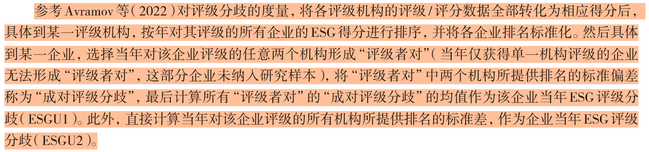 第四步,计算ESG评级分歧数据。方式1:"成对评级分歧":即两两标准差的总体均值;方式2:计算"行均值"后,总体均值;方式3:ESG评级标准化后的总体标准差;方式4:ESG评级的极差