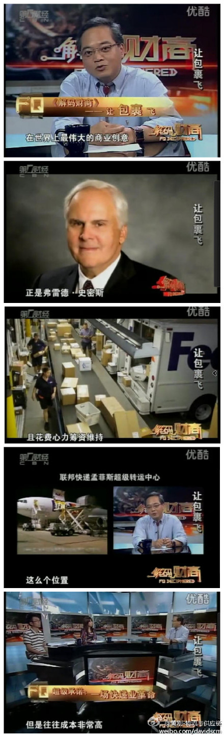 【让包裹飞,深度解读FedEx背后的创业故事】➀FedEx创始人史密斯学生时代设计FedEx运营模式的论文得了一个很差的C➁早期FedEx亏本,史密斯用几百美元赌博赢来2.7W美元来发工资➂品牌战略:超级承诺➃选址孟菲斯,位置犹如中国的武汉➄雇佣所有美国航空陆战队的航空兵开飞机...详情见视频http://t.cn/agU98g