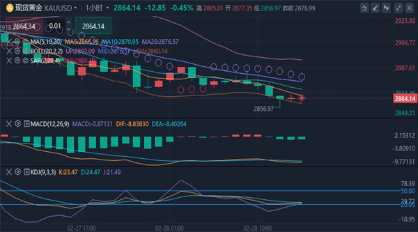 黄金延续了本周的下跌趋势,昨天初晴数据公布利好黄金,但是受到不可控的因数,导致极速下跌,尾盘修复到了2882附近。今日亚盘黄金从2883一路下跌至2856附近,直接跌破了昨天低点和上周的低点,这能反映出多头的趋势可能会不复存在,但是美指的强势,并没有及时的反馈到市场。四小时盘面来看,布林带下轨2858形成了强力支撑,冯喜运个人顺势看涨,短期阻力目前关注一小时布林带中轨2875和SAR指标2882附近,跟上方关注2890-2900区间。下方支撑留意今日低点2856和日线布林带下轨2850一线。综合以上,今日黄金以低位做多为主,高位做空为辅,黄金策略:2860多单持有,目标定2875-2880上破持有,高位2885-2890做空,2895补仓一次防守2900,目标2872-2868;