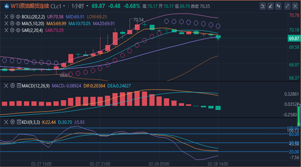 周五(2月28日)亚洲时段,美原油震荡微跌,目前交投于69.92美元/桶附近,跌幅约0.63%。路透技术分析师周五指出,美国原油未能突破 70.76 美元的阻力位,可能回撤至每桶 68.94 至 69.59 美元的区间。