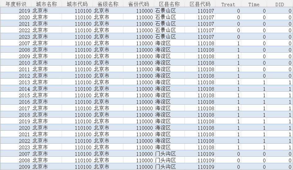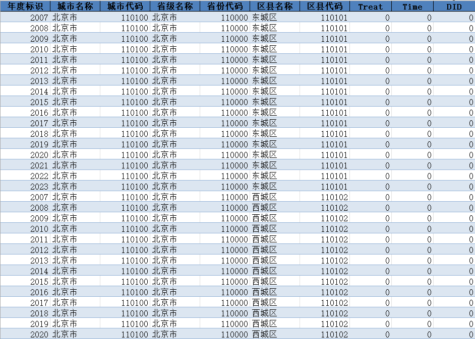 省份代码 | 区县名称 | 区县代码 | Treat | DID |