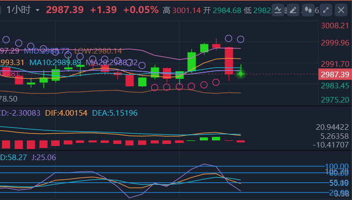 日K线一波连阳创新高之后,附图指标无力进一步跟上创新高的动能,从指标图来看,短线仍有回调需求,消息面的刺激,加上美元的弱势,限制了短期的调整空间,伴随着横盘整理修正再慢涨走高,一步一回头的走法呈现。4小时级别显示,MACD指标及KDJ指标偏空运行,但金价并未下破SAR指标2982美元支撑。只有下破此间支撑,金价才有机会触及更下方布林带中轨2867美元支撑。1小时级别,布林带走势张缩有度,目前并未逃离3000-2982区间运行。虽经过了小幅的上涨触及3001美元附近,但多次触及未完成上破。其次空头短期暂居优势,但是跌幅有限。更多的还是以多空拉锯为主。