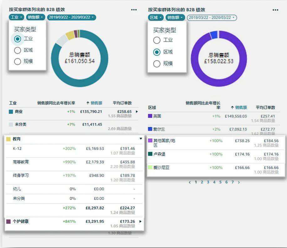 图中案例:这位卖家的教育类和个护健康行业销售额同比去年有大幅度地增长,其中高等教育,即来自大学的订单增长迅速。因此,这位卖家可以在店铺资料介绍、商品的外包装中加入“For Higher Education”, “For Healthcare”等关键词来获得更多此类买家的注意。在新品研发阶段,也建议卖家充分考虑此类买家对于商品使用的功能需求。