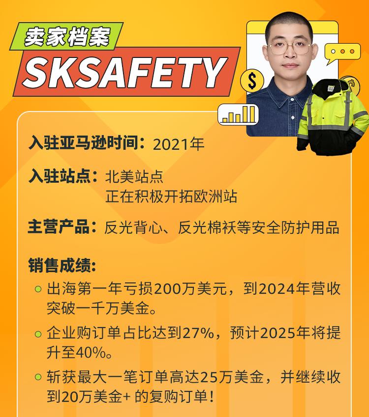 如今,SKSAFETY在亚马逊上的B端业务保持着快速的增长,来自亚马逊企业购的订单金额占比达到27%,预计2025年将提升至40%,年增长量高达200%。