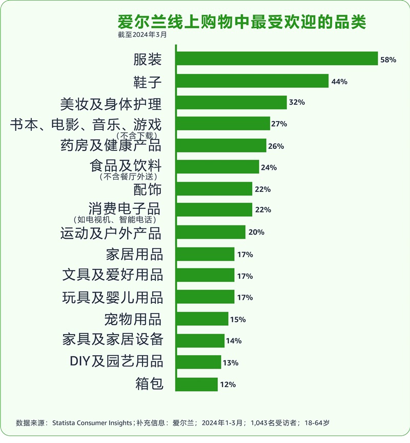 时尚类目、电子产品及健康个护等是爱尔兰消费者电商购物的热门选品。