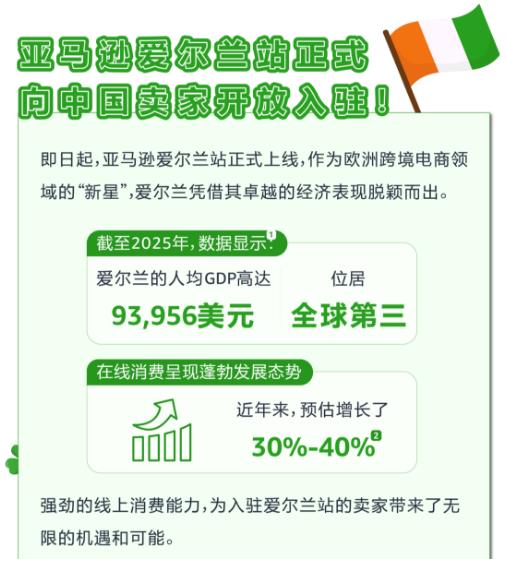 为了帮助更多卖家简化爱尔兰增值税合规流程,加速开启亚马逊爱尔兰站业务之旅。2025年1月1日之前,未在爱尔兰激活库存放置或未在亚马逊卖家平台上传爱尔兰增值税税号的卖家在2025年1月1日起至2025年12月31日期间,选择参与活动的税务顾问作为爱尔兰财务代理,在亚马逊爱尔兰站 (amazon.ie) 激活库存放置后,即可免费获享爱尔兰增值税注册和为期两年的免费申报服务,优惠可高达1900欧元。