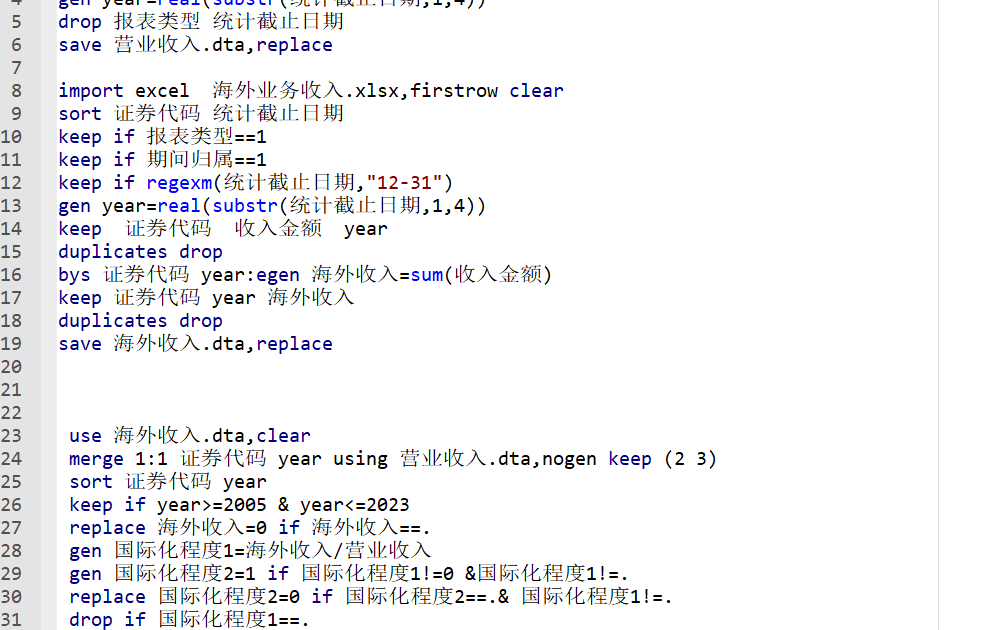 证券代码 年份 海外收入 证券简称 营业收入 国际化程度1 国际化程度2 股票简称 行业代码 行业名称 制造业取两位代码其他行业用大类 当年是否stpt 样本区间内是否stpt 是否金融 是否制造业 是否沪深上市 是否北证上市 重污染分组1 重污染分组2 重污染分组3 所属省份代码 所属省份 所属城市代码 所属城市 是否属于西部 是否属于东部 是否属于中部 产权性质 是否资不抵债。