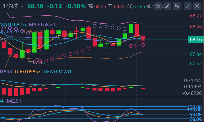 国际原油期货价格在周三于关键技术阻力附近受阻回落。盘中触及68.50美元的试探性上攻止步于68.97美元短期枢轴点下方,更关键的200日移动均线70.09美元构成顽固压制。当前油价小幅震荡上涨,尾盘触及68.2美元附近。若抛压再度加剧可能会下探67.0美元的支撑。但若能就此企稳,有望构筑更高次级底部,暗示多动力量重新积聚。其次、若油价下跌再次触及65.2美元,油价短期可能还会持续走低于,更下方参考周线布林带下轨64.5美元附近支撑。结合短期走势,建议参考68.5-66.0(±2)美元区间高沽低渣运行。