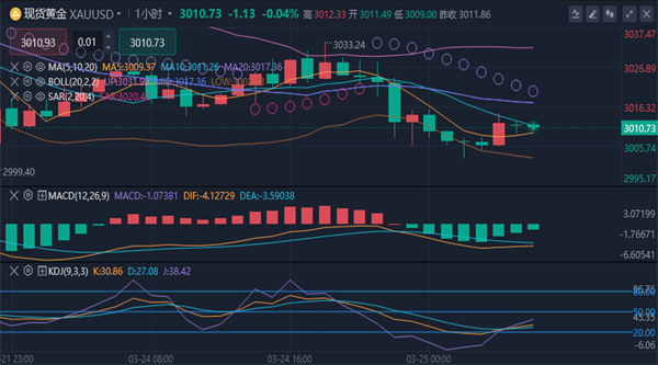 周二(3月25日)亚市早盘,现货黄金窄幅震荡,目前交投于3011.87美元/盎司附近。金价周一下跌0.4%,盘中一度跌至3002.43美元/盎司,收报3011.86美元/盎司,美元触及逾两周最高,