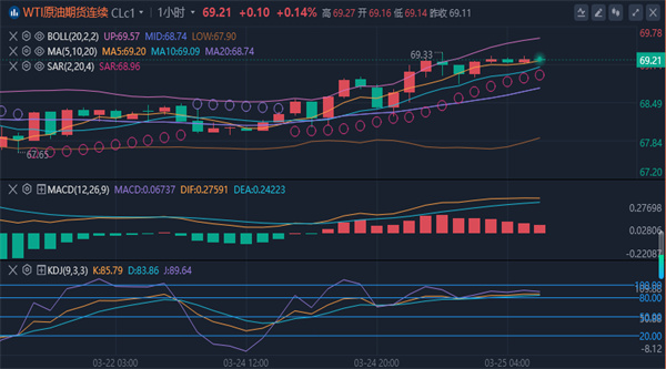 原油从日线图级别看,中期走势在跌破区间下沿后,持续围绕低位次要震荡运行。油价受到均线系统的压制,中期客观趋势向下。但从动能上看,空头优势并不强劲,预计中期走势仍将维持一段震荡节奏,等待向下突破确立下行。原油短线(1H)走势在区间上沿受阻回落,最终反弹回暖,并未突破创新高点。多空动能互相焦灼,短线客观趋势方向不明朗,主观方向向上,预计日内原油有望突破区间上沿阻力继续向上,空间有限。 综合来看,原油今日操作思路上以回踩低多为主,反弹高空为辅,上方短期关注70.2-70.7一线阻力,下方短期关注68.3-67.8一线支撑。