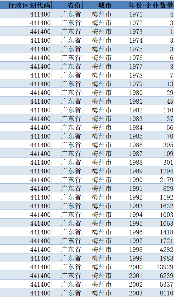 行政区划代码 | 省份 | 城市 | 年份 | 企业数量 |