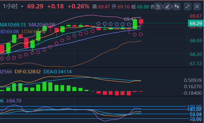 WTI原油价格于上涨触底66.0美元附近后持续小幅震荡走高。本周初油价开盘一度给到68..3美元附近,虽有回撤,但回撤力度偏弱,在触及67.9美元附近后再次反弹走高至69.3美元附近一线。短期上方更多参考70美元关口附近看多空。下方暂时建议参考68.0美元附近支撑看多。上破短期再看71-72美元范围压力。下破再看上周低点66.0美元附近和前低65.2美元附近支撑。