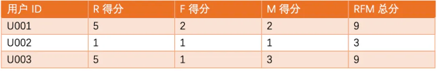 计算后,每个用户的RFM得分如下: