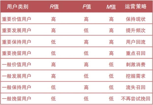 根据RFM得分,我们可以把客户分成不同类型,并制定不同的营销策略: