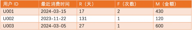 例如,U001最近一次消费是3月15日,今天是4月1日,所以R = 17天。