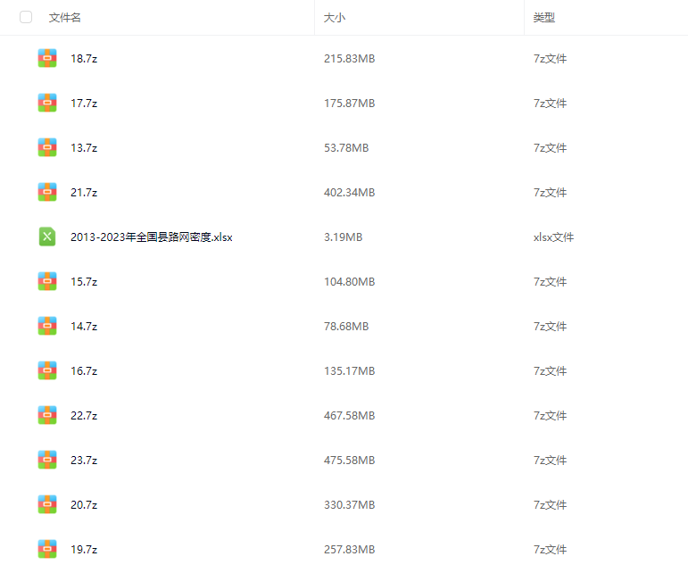 相关变量:FID、Shape *、县名、县代码、市名、市代码、省名、省代码、年份、县.面积、路网总长度、路网密度。