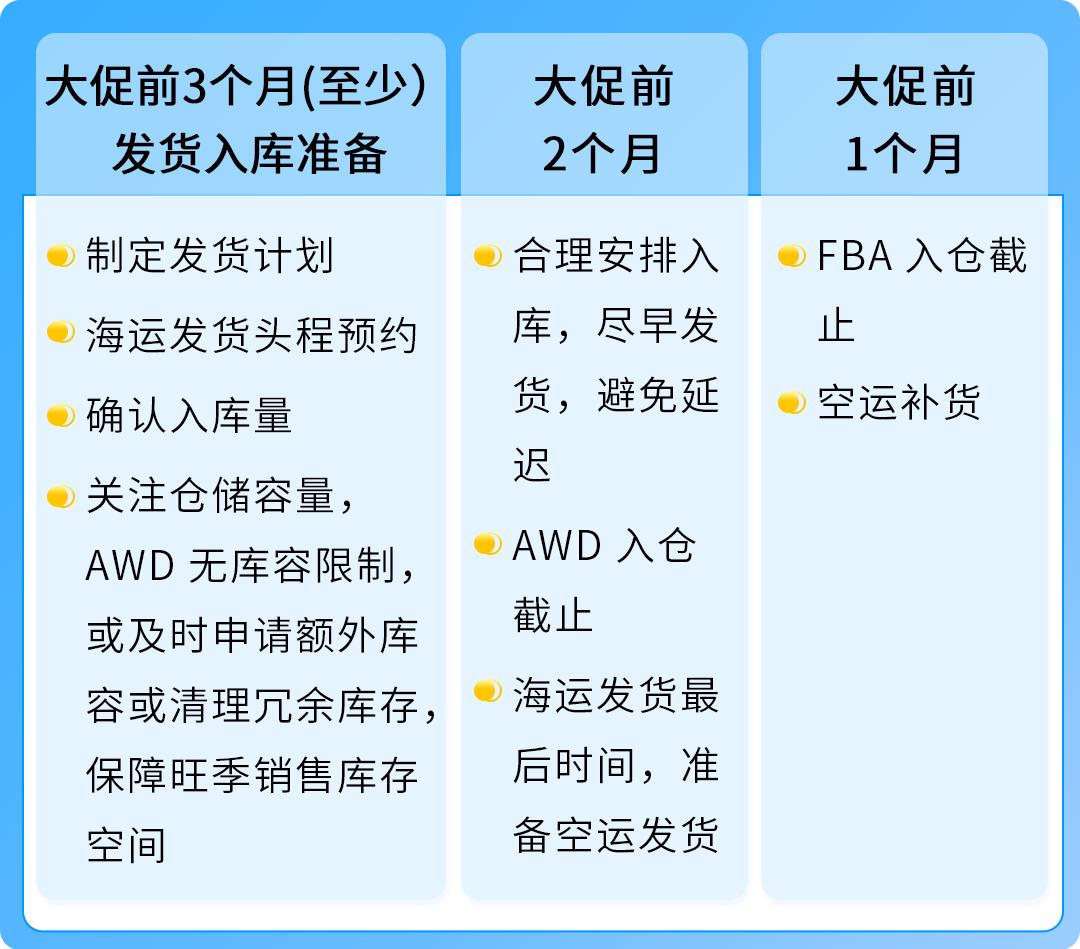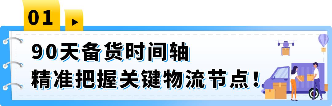 旺季爆单,物流先行!精准规划发货节奏是决胜Prime会员日的关键。亚马逊建议您提前至少90天启动大促物流计划,正确拆解备货节点,确保每一批货物准时入库,抢占销售黄金期!