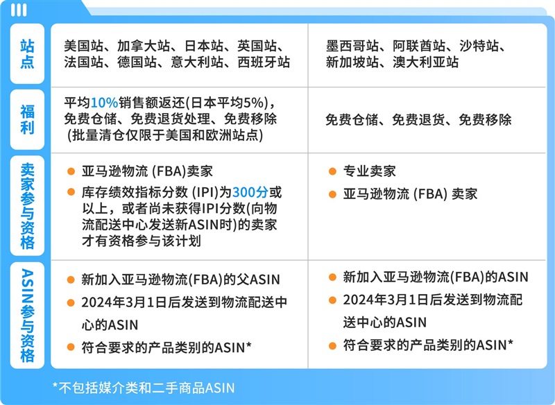 为了帮助卖家朋友降低测试新选品的成本,特别推出 “亚马逊物流新品入仓优惠计划”,减免多项FBA费用,还有销售额返还福利。