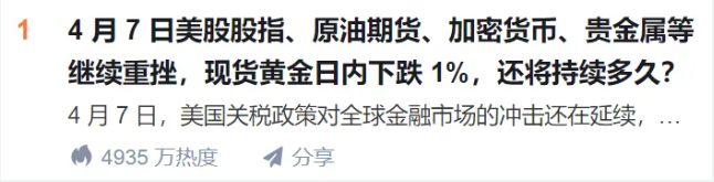 4月7日,美国关税政策对全球金融市场的冲击仍在肆虐,周一亚市早盘,美股股指、原油期货、加密货币、贵金属等资产齐齐重挫,市场一片风声鹤唳。