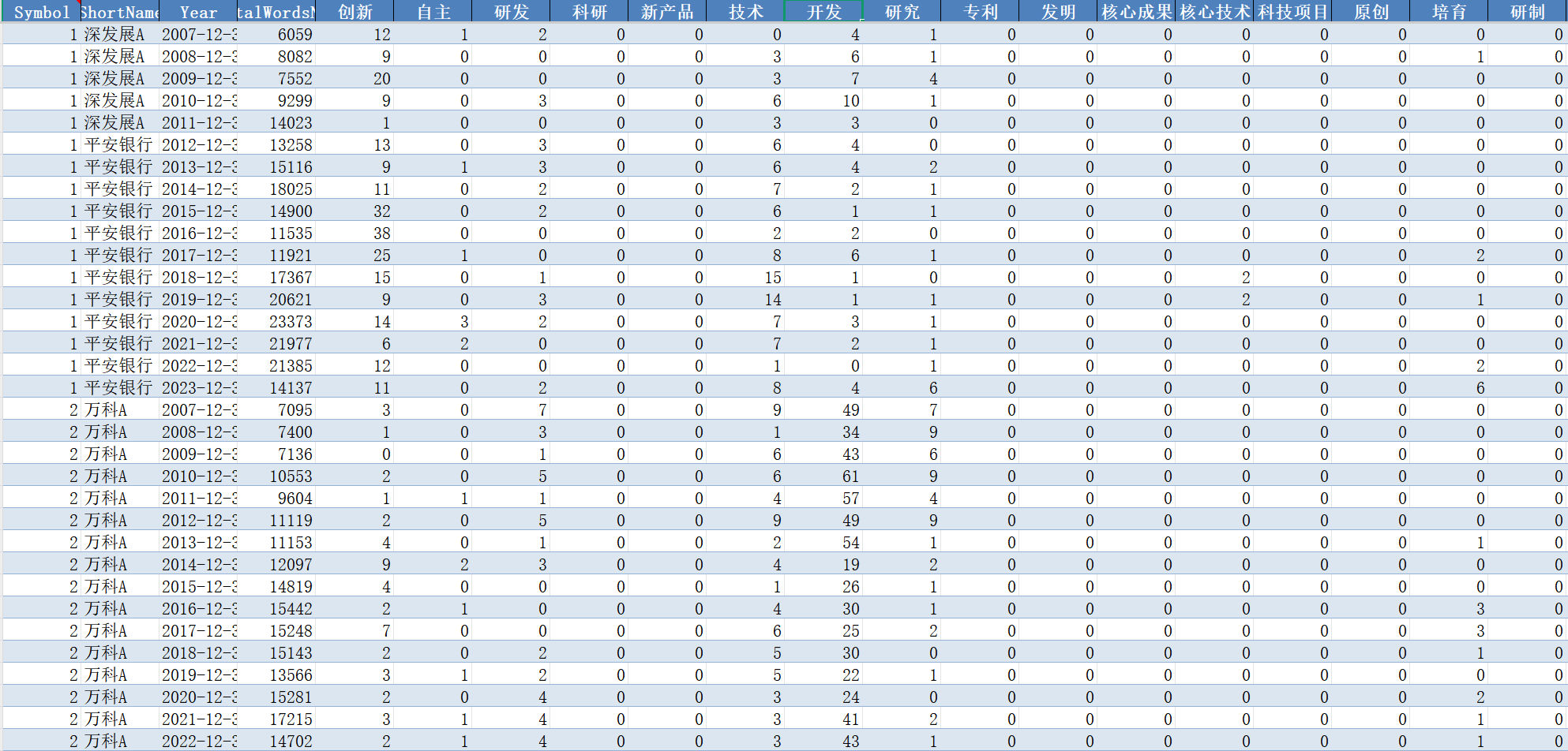 全文总词数 | 词集总词频 | 词频占MD&A总词频的比例 |