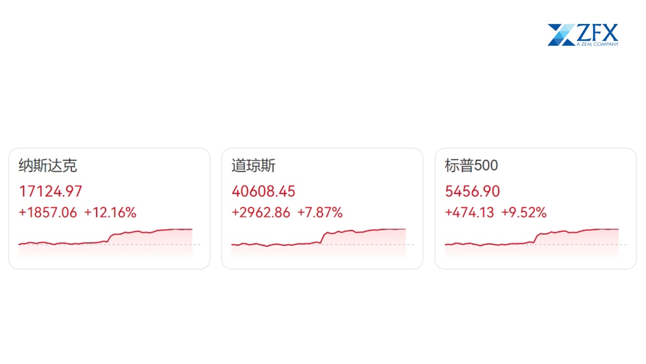 在多国暂缓实行关税的消息公布后,美国三大股指直线拉升超6%,临近尾盘涨幅进一步扩大,道指最大上涨点位超3100点。