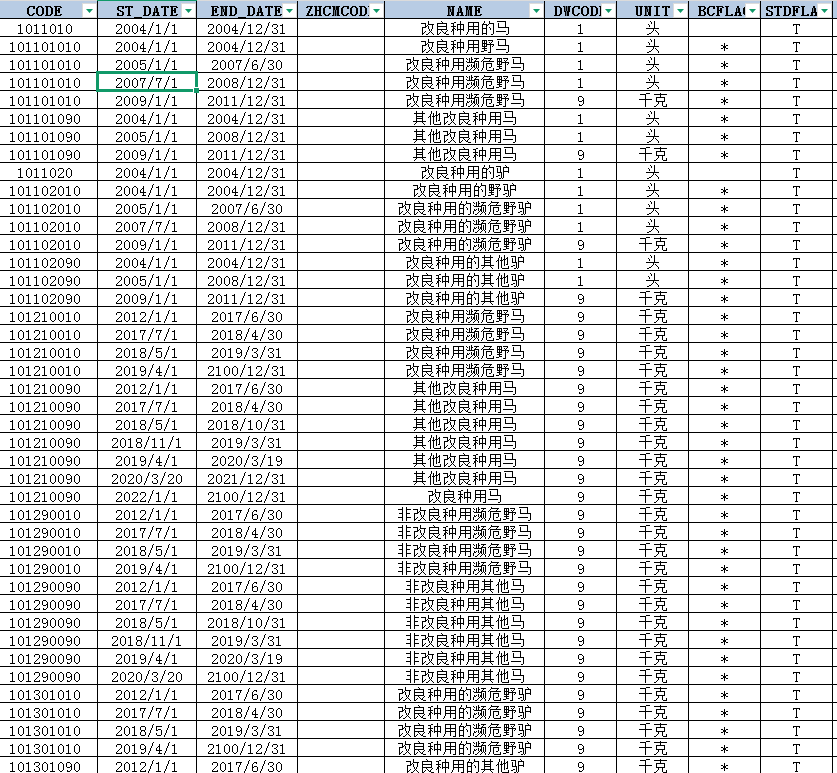 CODE、ST_DATE、END_DATE、ZHCMCODE、NAME、DWCODE、UNIT、BCFLAG、STDFLAG、DWFLAG、SZ、ZSSL_SET、CLDE、CJDL、TSL、SPLB、TSFLAG、NOTE。