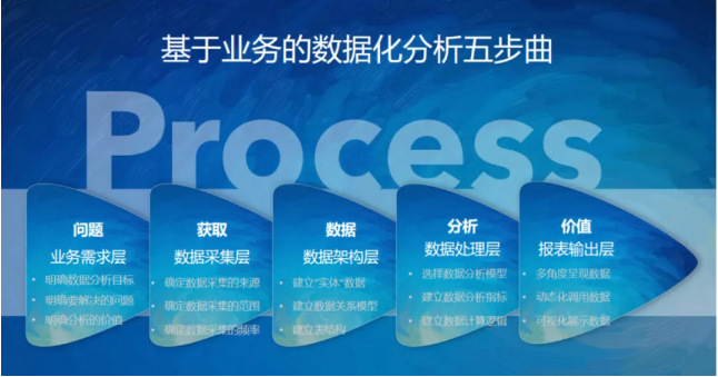 拥有好的报表工具和呈现形式是基础,但更核心的是科学的数据分析流程。如何确保我们的分析是围绕业务目标、解决实际问题的呢?这里介绍一个“基于业务的数据化分析五步曲”。