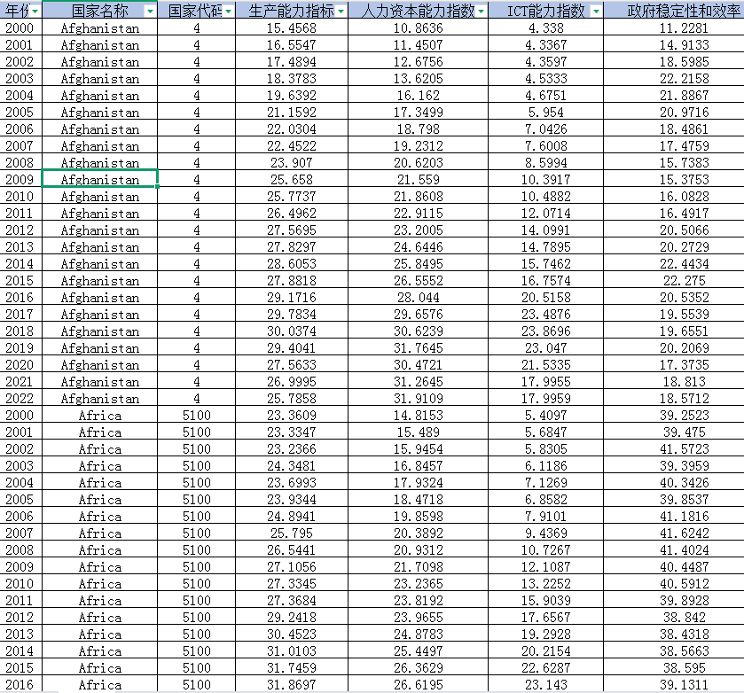国家名称、国家代码、生产能力指标、人力资本能力指数、ICT能力指数、政府稳定性和效率、自然资本能力、跨境贸易便利性、结构变化、交通运输能力、能源能力。