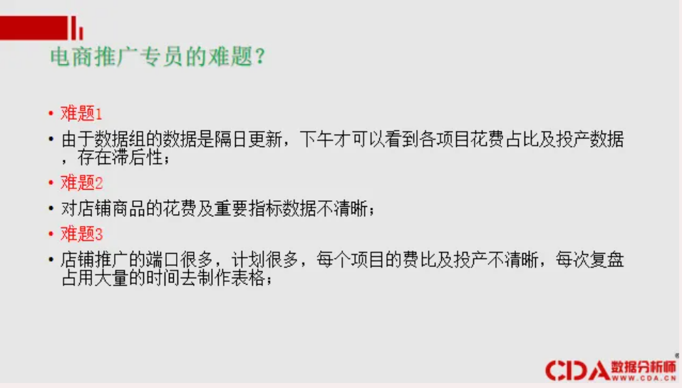然而,电商数据分析也面临诸多挑战。数据组数据隔日更新,导致数据时效性差,影响问题的及时分析和处理;商品花费和重要指标数据不清晰,难以深入了解业务情况;店铺推广端口和计划繁多,数据整理和表格制作耗费大量时间。