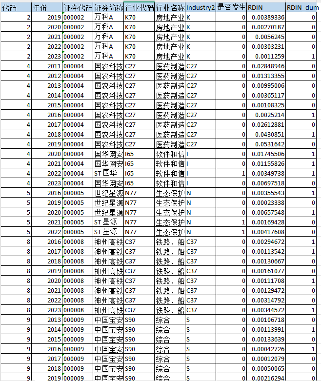 代码 年份 证券代码 证券简称 行业代码 行业名称 Industry2 是否发生ST或ST或PT RDIN RDIN_dum