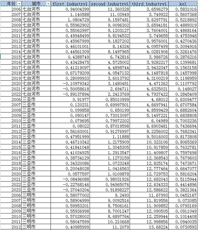 年份、城市、第一产业人数(first_industry1)、第二产业人数(second_industry1)、第三产业人数(third_industry1)、专业化指数(ksi)。