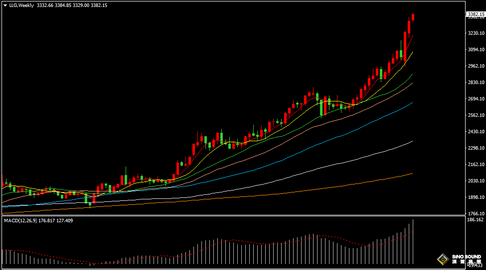 周线图剖析一波:黄金连续二周大幅上涨,自4月最低点2956美元至今日3382美元,金价爆涨超426美元,金价历史高点推升至3384.85美元。周线指标看,短中长期均线维持多头排列,MACD指标正动能柱维持高量,RSI指标在81位置附近运行。