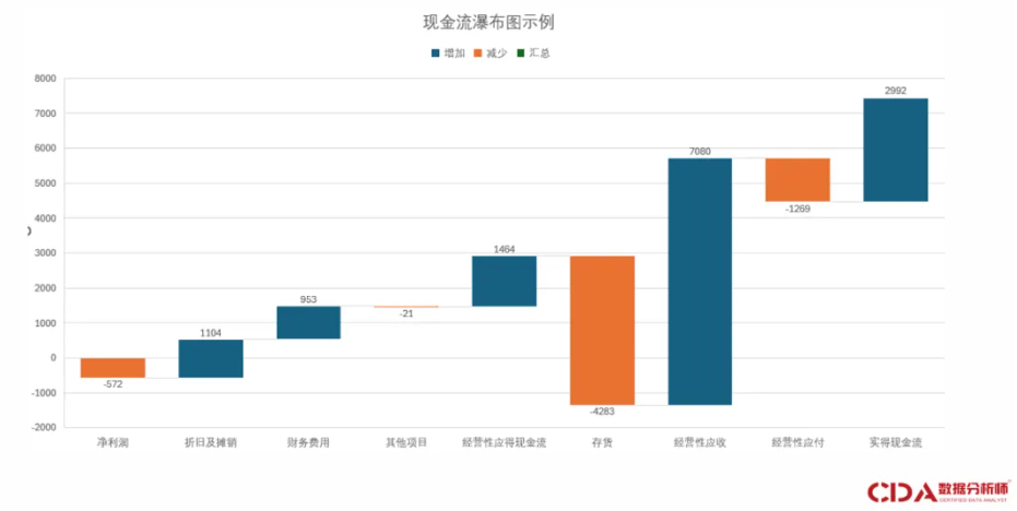 在瀑布图中,蓝色部分表示对数值的正向影响,橙色部分表示负向影响。通过这种直观的展示方式,我们可以清晰地看到各项因素对最终结果的影响。