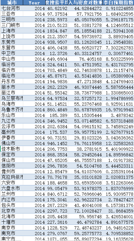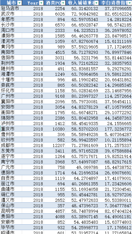 李白指数数据,包含李白预期指数与李白消费指数,该数据参考刘逸的测算方法,其中李白预期指数计算方法为统计各个城市十个百度搜索指数关键词(白酒,红酒,黄酒,啤酒,酒吧,喝酒,解酒,戒酒,酗酒,酒精中毒)计算其每个城市的日均搜索平均值,李白消费指数为统计各个城市酒类POI数据(烟酒专卖店,酒吧,夜总会,KTV,迪厅),其中POI数据19年之前来源于百度地图,19年之后来源于高德地图,因为疫情的影响,20年后的数据会有部分缺失。由于百度搜索关键词数据和酒类POI数据会受到常驻人口密度和人均可支配收入的影响,为计算李白预期指数和李白消费指数,将平均百度搜索指数关键词与城市POI其除以统一量纲后(将两个数据取自然对数处理)的人口密度和可支配收入,实现人口规模和收入水平干扰因素的消减,整理为面板数据,方便大家研究使用。