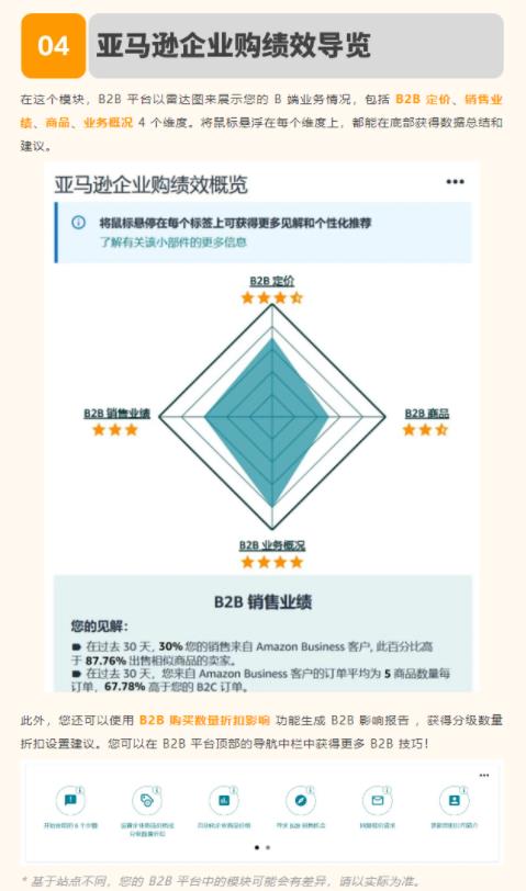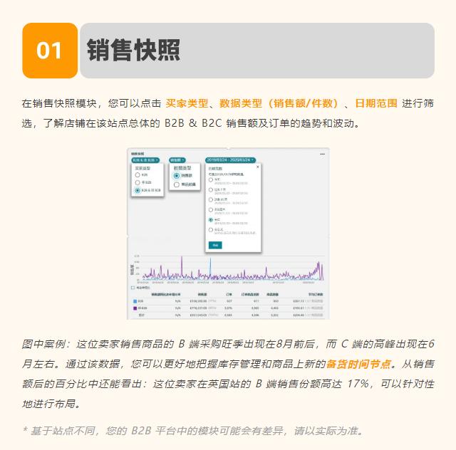 B2B 平台有 销售快照、企业购绩效概览、按买家群体列出的热销 B2B 商品、按买家群体列出 B2B 绩效、B2B 购买数量折扣影响 等实用功能模块,您可以通过它们了解店铺的 B 端业务状况。