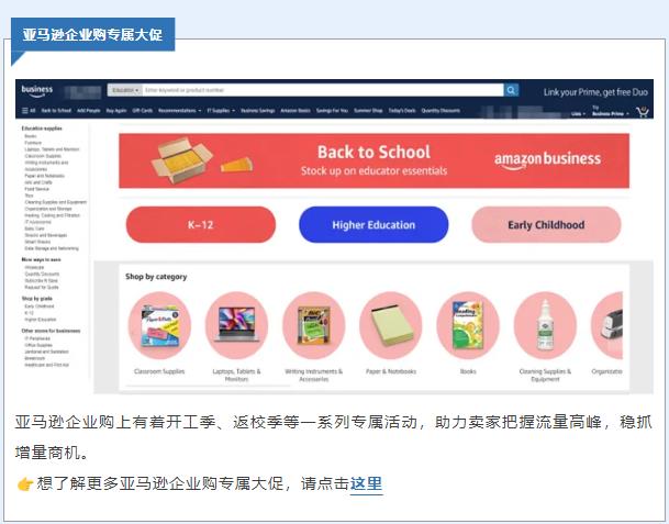 亚马逊企业购上有着开工季、返校季等一系列专属活动,助力卖家把握流量高峰,稳抓增量商机。