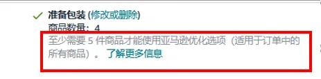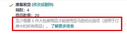 在创建货件的过程中,卖家可以通过获得“亚马逊优化的货件拆分”入库选项,来豁免入库配置费。但获得该选项需要满足一定条件,即每件商品(SKU)至少包含5个相同的纸箱或托拍,每个纸箱或托拍必须包含相同的每件商品数量及商品组合。
