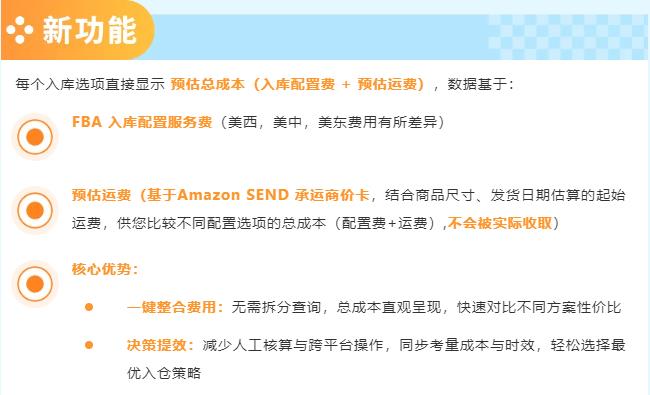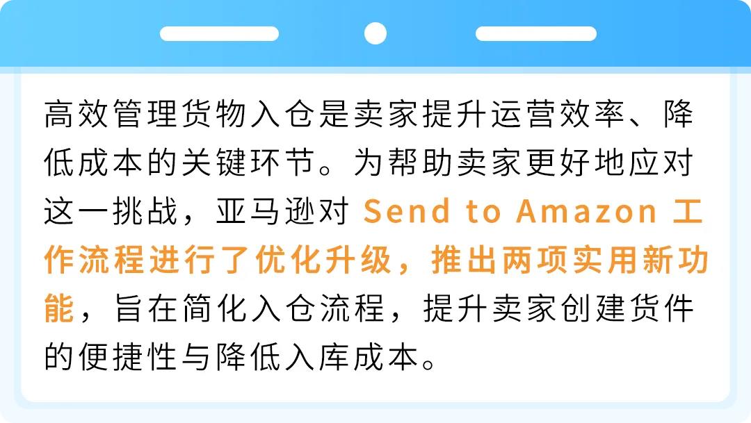 亚马逊 Send to Amazon 功能升级,从资格预判到成本估算,全面提升入仓效率!旺季已至,请卖家尽快体验新功能,结合货件需求灵活运用,精准把控入仓成本与时效,解锁智能入仓新体验!