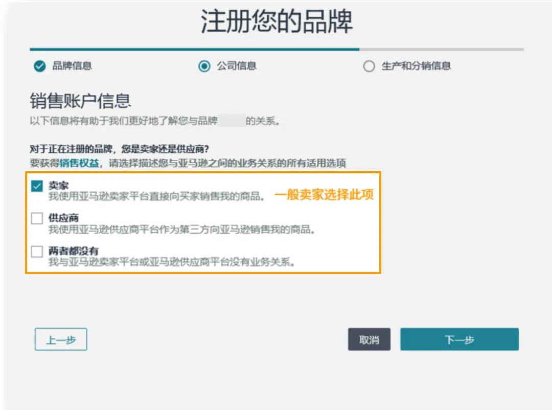 点击选择“卖家”,并选择“所有销售您所申请品牌的卖家账号”;