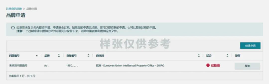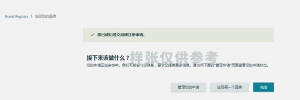 注册提交完成,请您及时查看申请邮箱或者点击“管理 > 品牌申请”,查看备案状态。收到验证码发送通知后,请按邮件的提示获取验证码,并及时回传验证码。