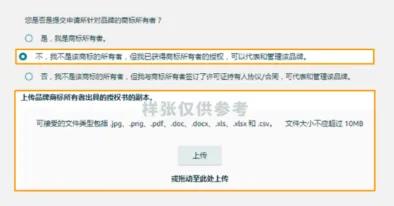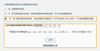 添加商标详情后,系统可能会问:“您是否是提交申请的品牌的商标所有者?” 选择最适合您情况的选项。如果遇到请您按照下述提示,选择并提供与商标所有者的关系提供文件 ,完成提交: