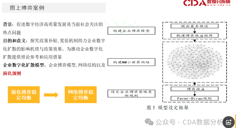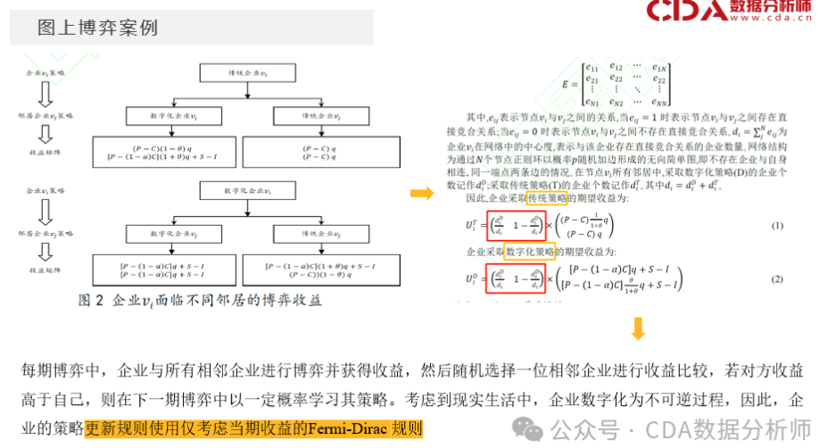 首先提出接近现实的假设,构建博弈收益矩阵或支付函数,考虑企业在网络中的上下游联系,设定博弈策略更新规则。由于求解解析解往往比较复杂,通常通过数字模拟来分析,生成网络并根据设定的函数和规则进行重复模拟,从而确定哪些因素对企业数字化扩散有重要影响。