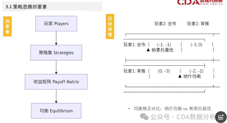 博弈论的本质是策略互动,主要解决个体最优与集体理性的矛盾,以及动态策略的预判。其核心要素包括至少两个玩家、多个策略组成的策略集、收益矩阵和均衡。
