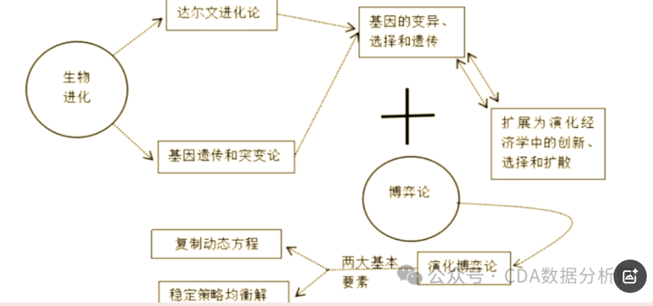 演化博弈:近年来在网络上备受关注,它将博弈论与生物进化中的基因变异、选择和遗传相结合,研究创新选择和扩散。核心要素是复制动态方程和稳定策略的均衡解。