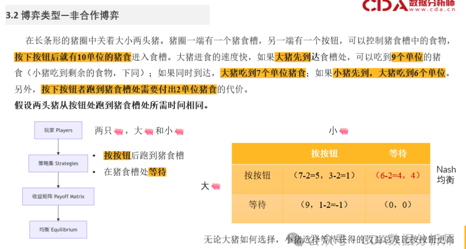 非合作博弈:常用于策略选择。以智猪博弈为例,大猪和小猪面临按按钮获取食物还是在食槽等待的策略选择。通过构建收益矩阵可以发现,无论大猪如何选择,小猪选择等待的收益都是最高的,这就是非合作博弈中离散策略的一种均衡情况。在企业决策中,非合作博弈可以用于分析市场竞争中企业的定价策略、投资决策等。