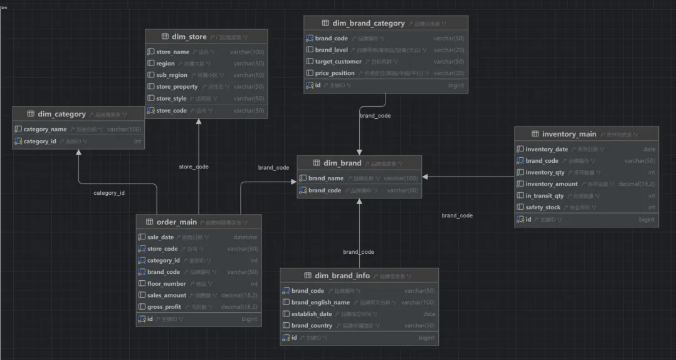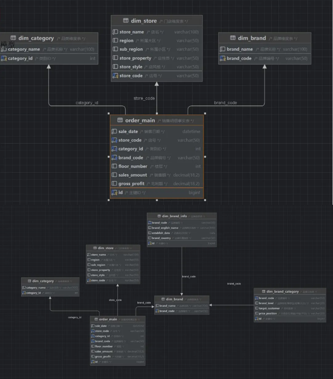 电商案例中常用星型模型,包含一个事实表,包括销售明细事实表order_main,记录销售日期、门店、品类、品牌、销售额、毛利等;多个维度表如“门店维度表dim_store”、“品类维度表dim_category”、“品牌维度表dim_brand”。这些表通过键值关联。