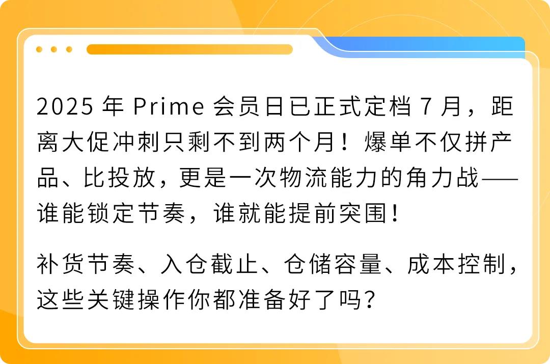 旺季爆单,物流先行!时间紧、任务重,从现在开始,每一步操作都要踩准节奏。登录卖家平台,立刻查看补货建议、仓储容量,冲刺Prime会员日!