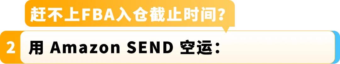 紧急补货,如何赶在 FBA 入仓截止日期前抵达?建议您使用 Amazon SEND 空运 —— 爆款产品紧急补货,快速且稳定的时效,减少断货风险。无需手动填写入仓时间,保障履约稳定性;多时效门到门服务与专业清关,降本增效;亚马逊协议价透明实惠,更有优先入仓特权加速流程。0.5kg起运量,最快4天可到美国,门到门全程服务和专业清关服务,减少运营成本。